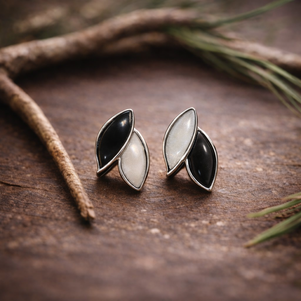 Elegant leaf-inspired stud earrings featuring a rich black and white swirl enamel paired with a soft ivory finish. A perfect blend of modern design and natural elegance for everyday wear.